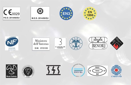 Ogni estintore è soggetto a omologazione da parte dei competenti organismi delegati da ogni paese; inoltre, sono prodotti e certificati secondo la direttiva in materia di attrezzature a pressione (PED, Pressure Equipment Directive) 2014/68/EU con marcatura CE.