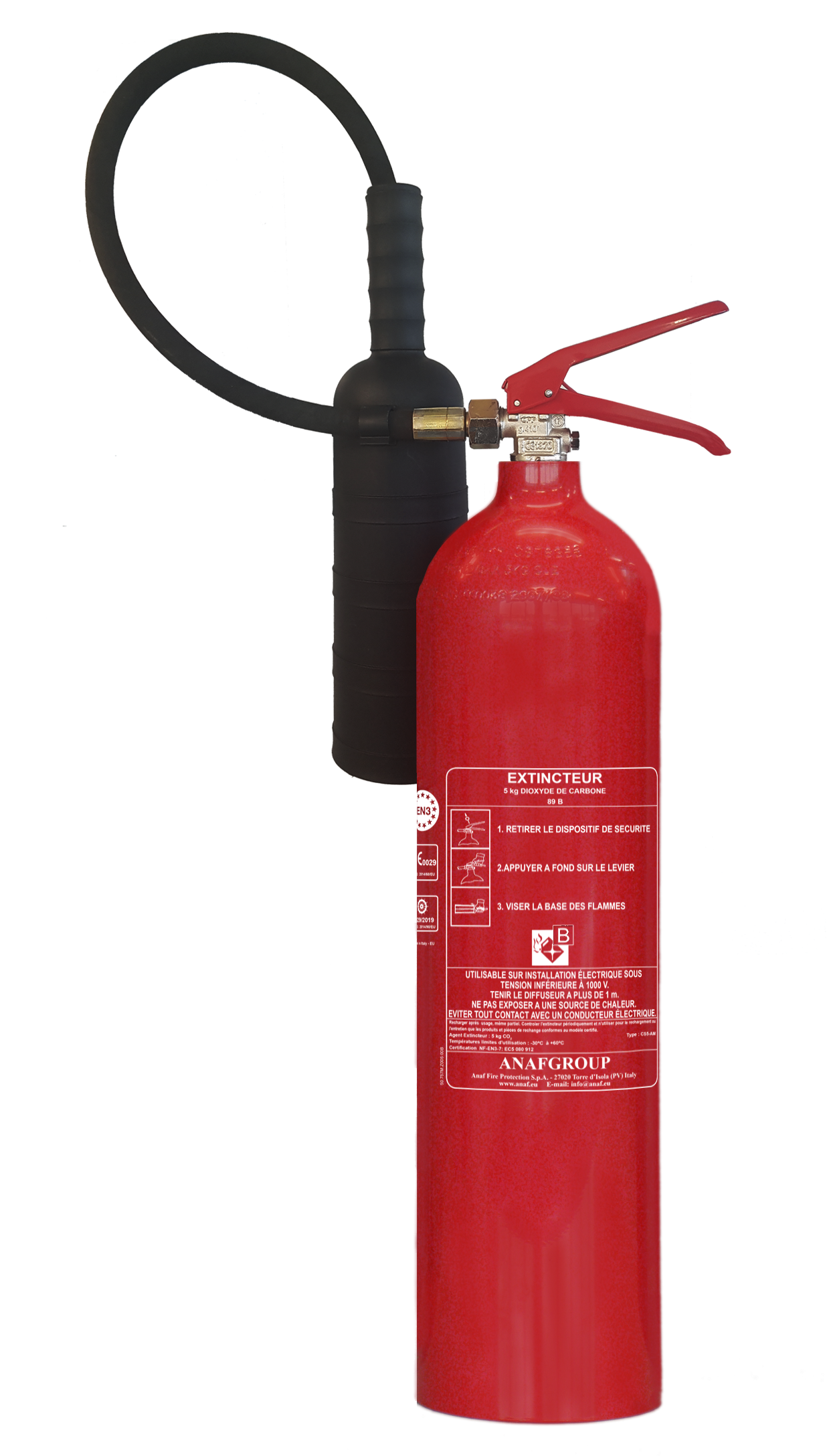 Portable, carbon dioxide fire extinguisher, aluminum, 5 kg, with lever valve and front horn with flexible hose, with MED certificate