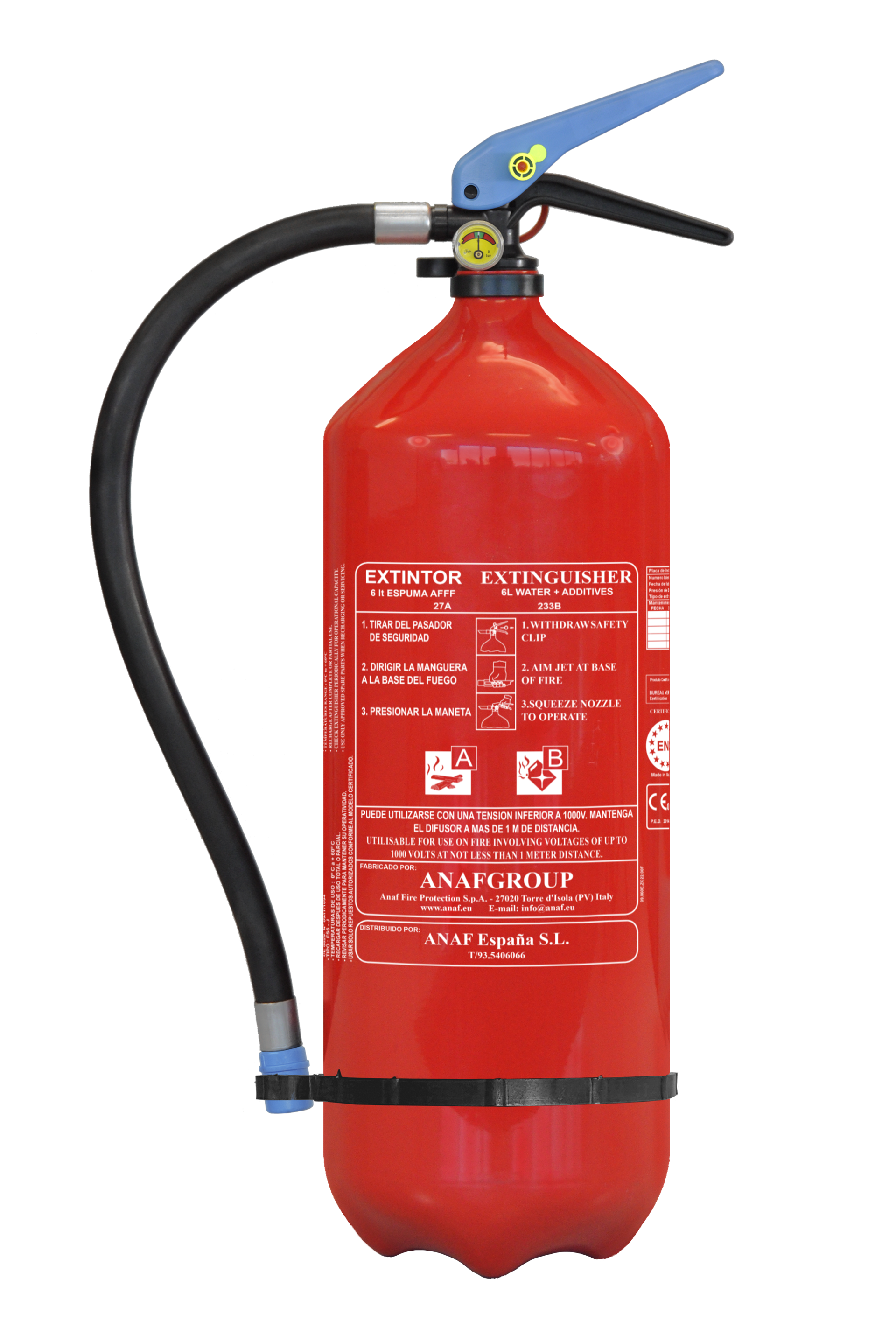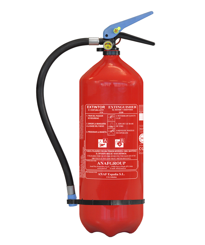 Portable, stored pressure, spray foam fire extinguisher, aluminum, 6 Lt, with squeeze grip acetal resin valve, with pressure gauge