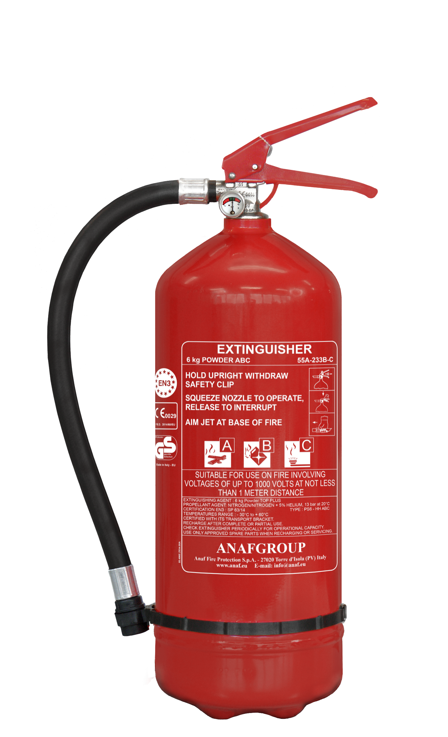 Portable, stored pressure, ABC, TOP and TOP PLUS powder fire extinguisher, 6 kg, with aluminum lever operated valve, with pressure gauge, with MED certificate