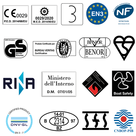 Alle unseren Feuerlöscher müssen von den jeweiligen nationalen beauftragten zuständigen Stellen genehmigt werden. Darüber hinaus werden sie gemäß der Druckgeräterichtlinie (PED) 97/23/EG mit CE-Kennzeichnung hergestellt und zertifiziert.