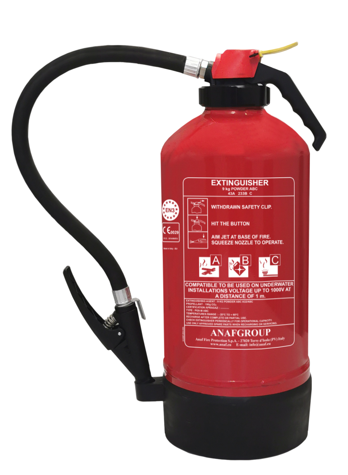 PG9-M is a portable fire extinguisher with ABC powder, steel body and a strike knob valve with polyammide - glass fiber reinforced body