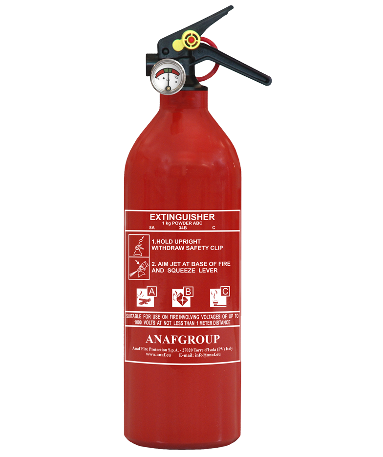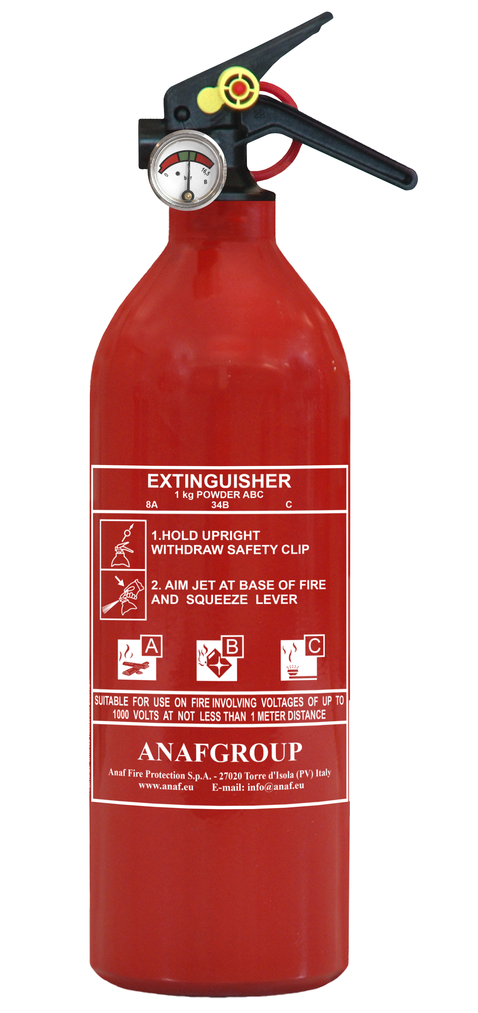 Portable, stored pressure, ABC and TOP powder fire extinguisher, aluminum, 1 kg, with squeeze grip acetal resin valve, with pressure gauge