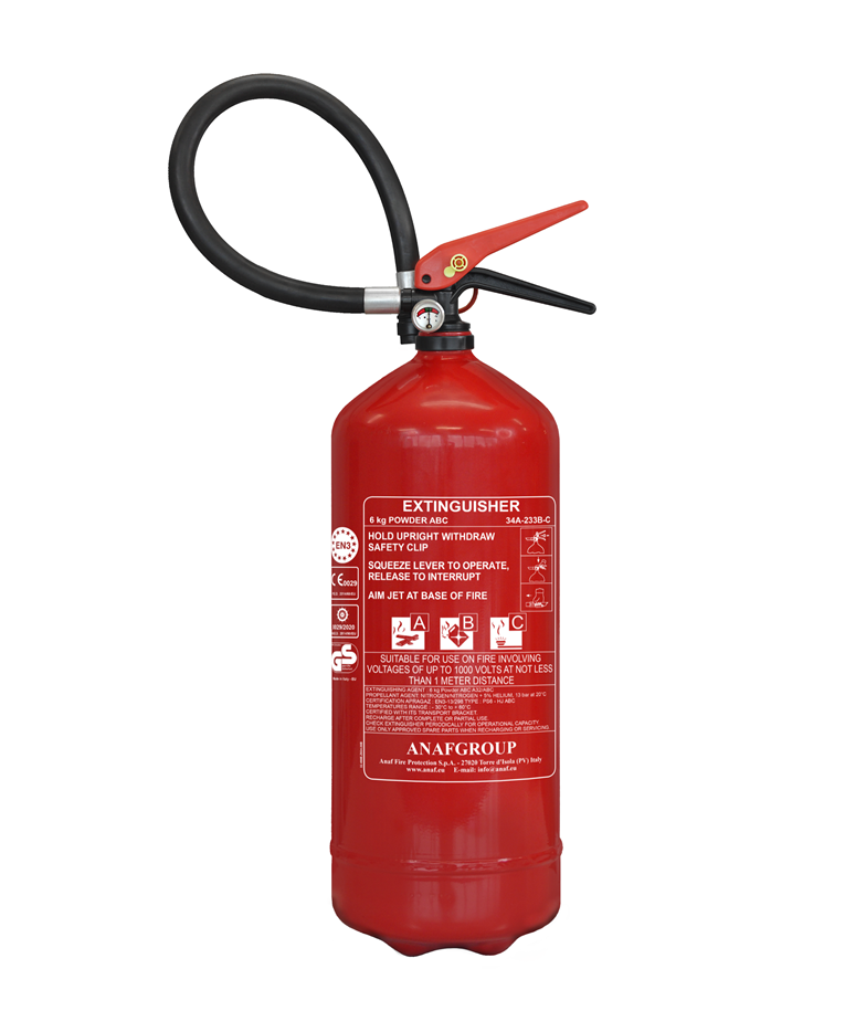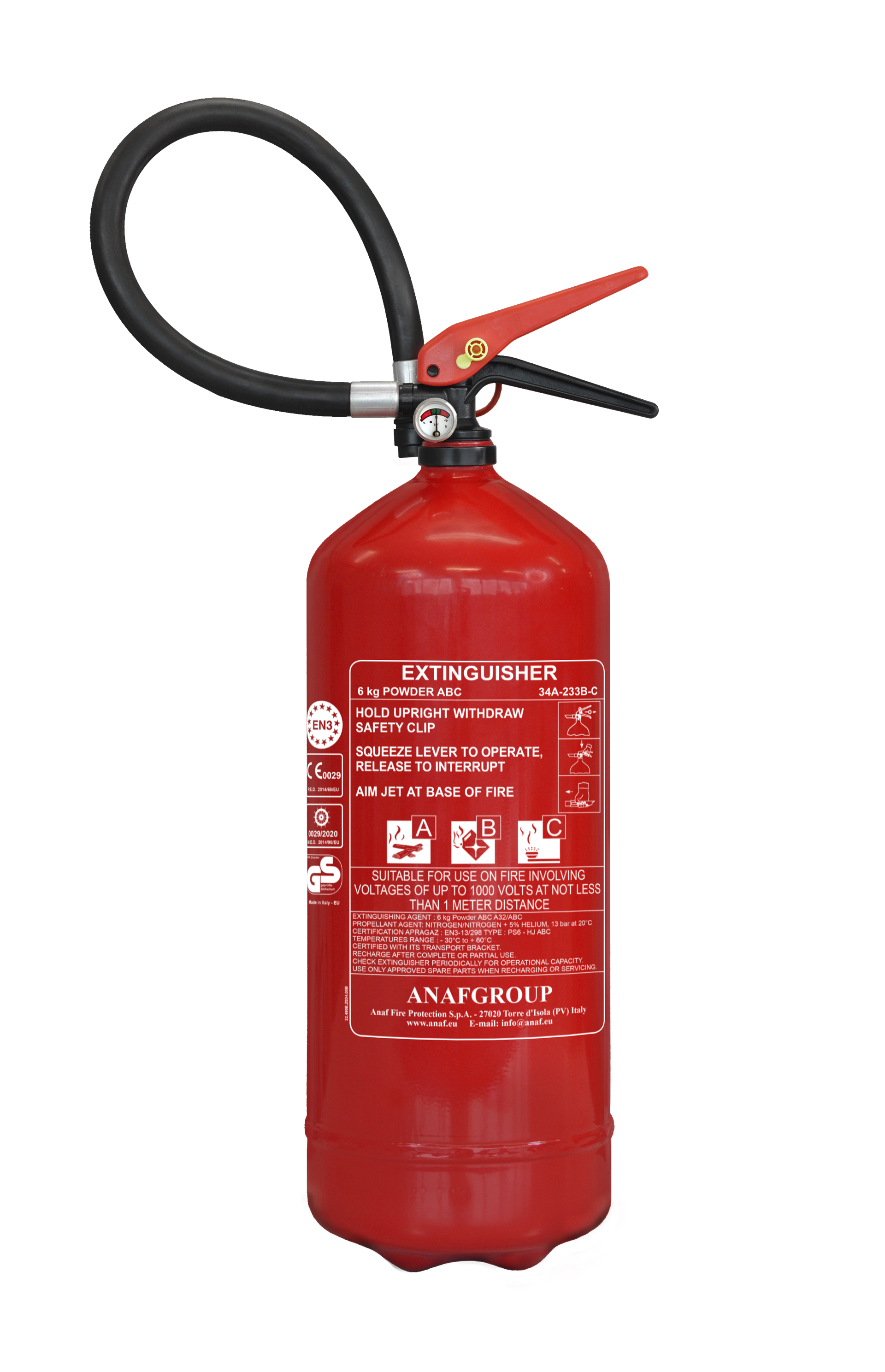 Portable, stored pressure, ABC, TOP and TOP PLUS powder fire extinguisher, 6 kg, squeeze grip acetal resin valve, with pressure gauge