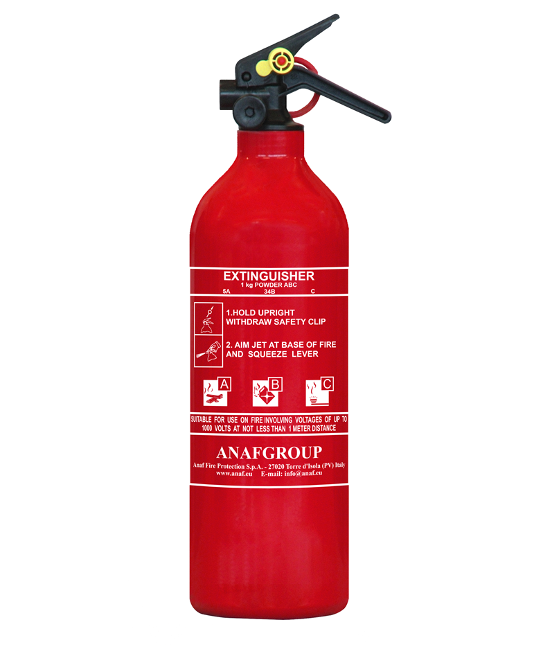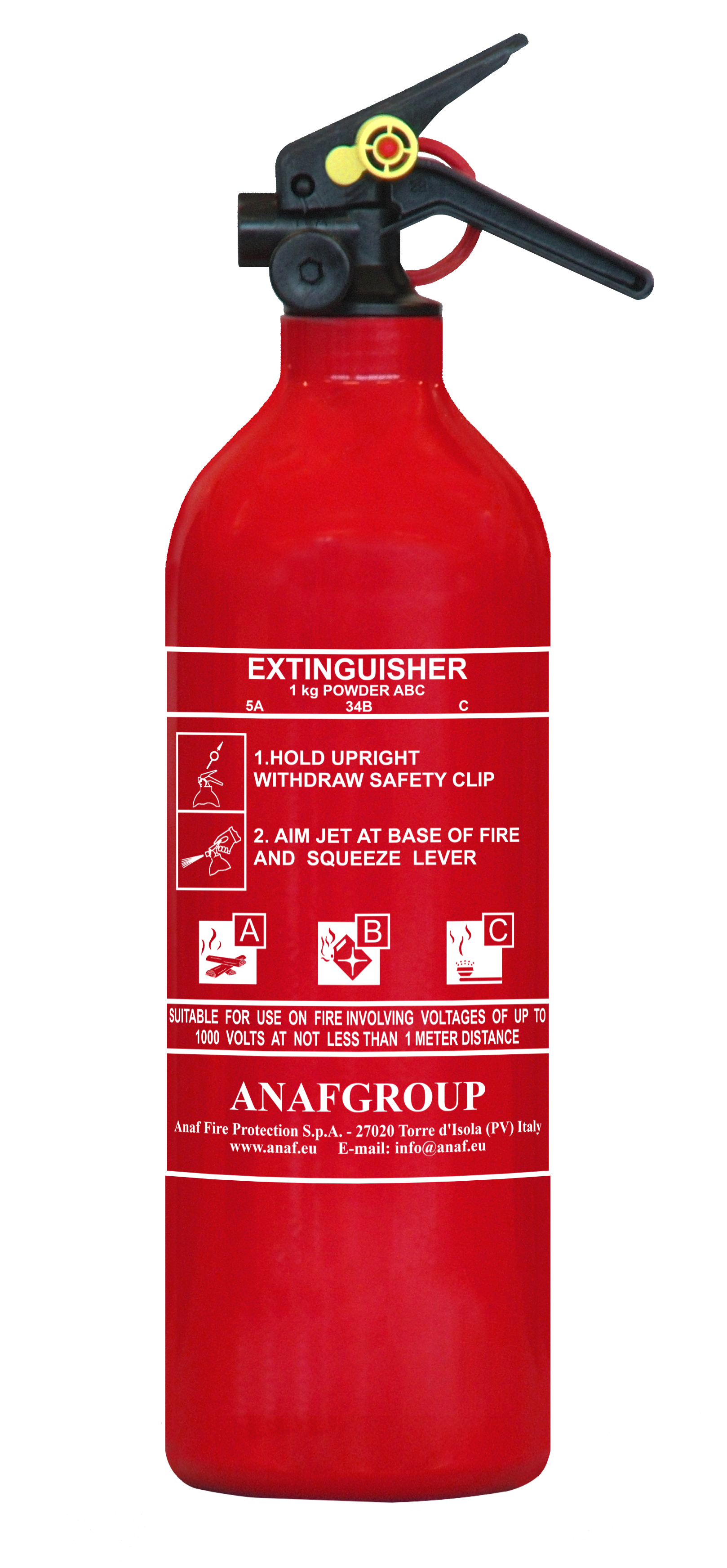 Portable, stored pressure, ABC powder fire extinguisher, aluminum, 1 kg, with squeeze grip acetal resin valve, with MED certificate