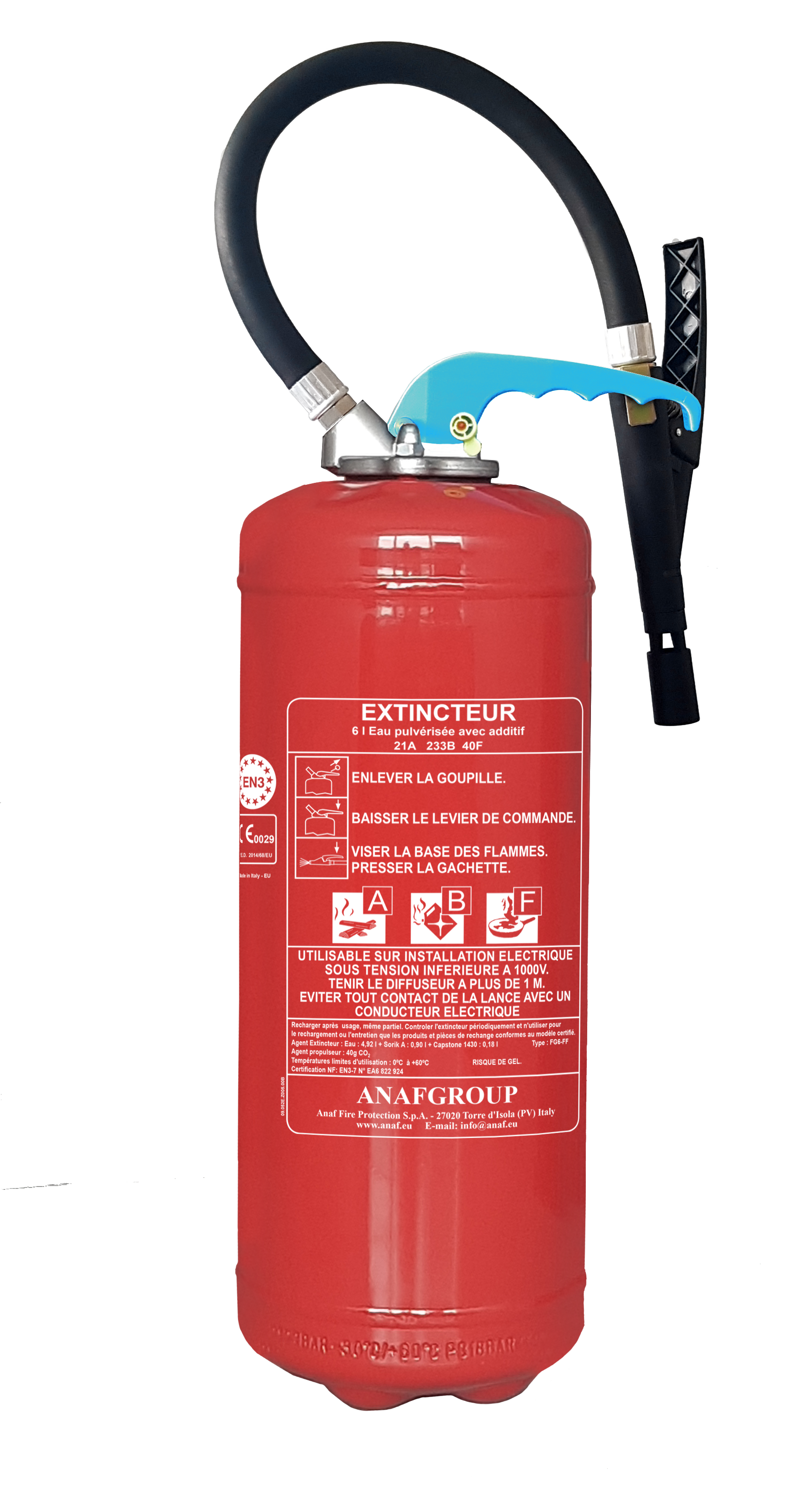 FG6-FF est un extincteur à pression auxiliaire à eau pulvérisée prémélangé avec corps en acier avec un revêtement interne PE. Certifié selon la Directive Equipements sous Pression PED 2014/68/EU et NF-EN3. Capacité 6 l.