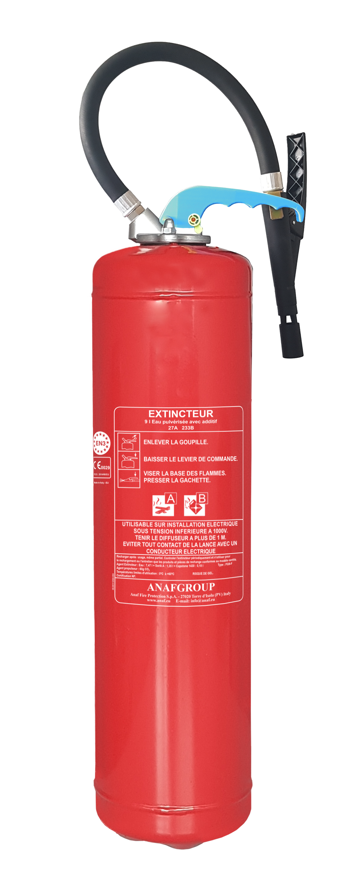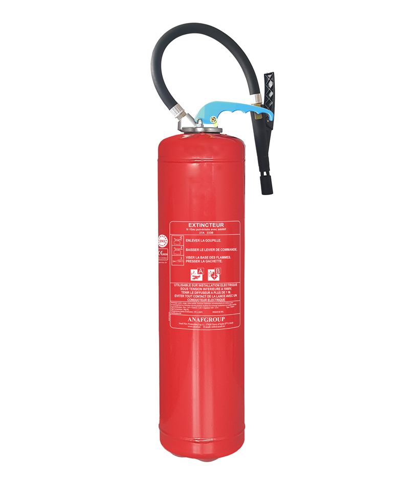 FG9-F est un extincteur à pression auxiliaire à eau pulvérisée prémélangé avec corps en acier avec un revêtement interne PE . Certifié selon la Directive Equipements sous Pression PED 2014/68/EU et NF-EN3. Capacité 9 l.