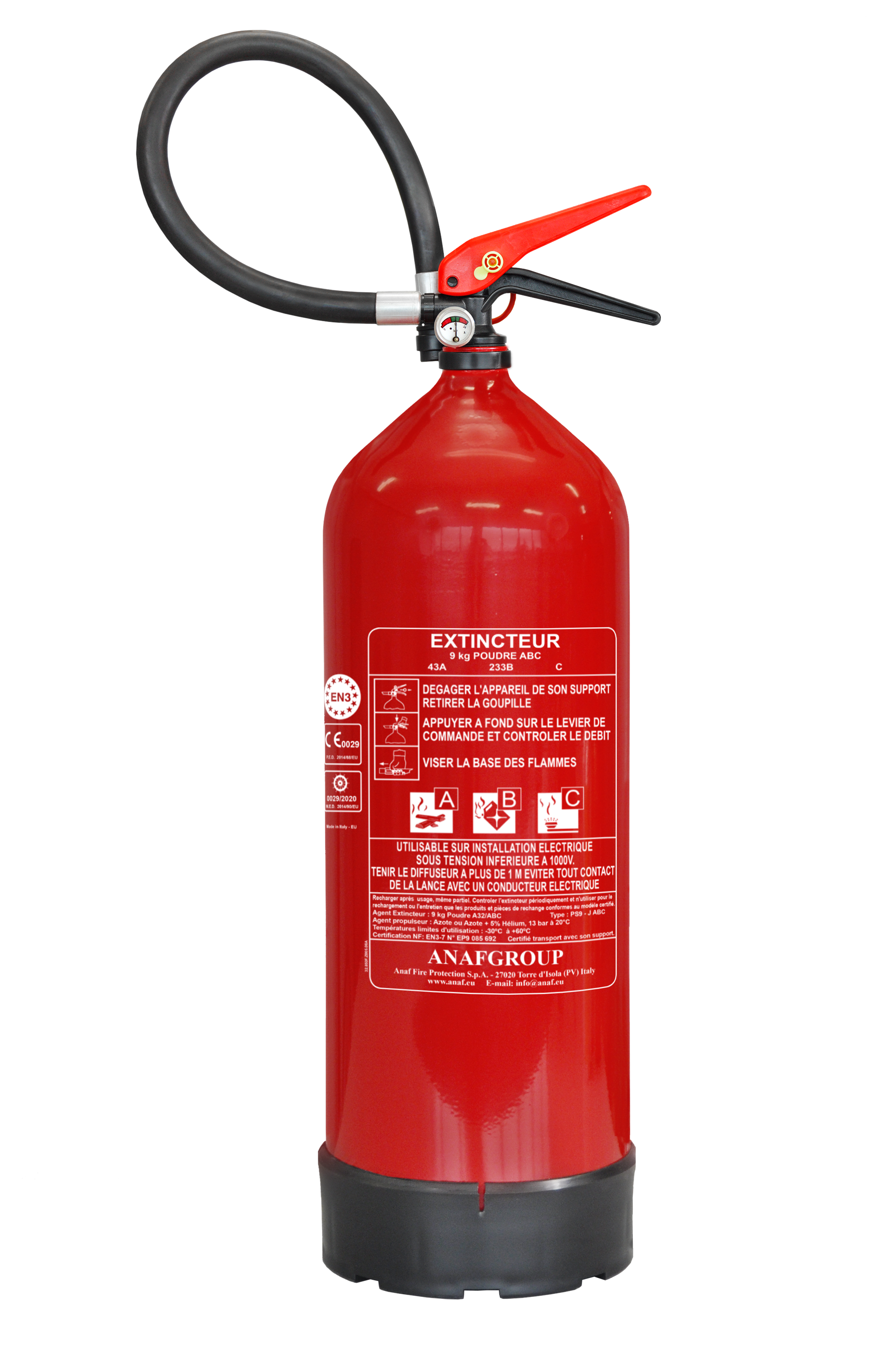 PS9-J ABC est un extincteur pressurisé à poudre avec manomètre. Températures d’utilisation de –30°C à +60 °C, par conséquent adéquat aussi dans les pays à températures extrêmes. Certifié selon la Directive Equipement Sous Pression PED 2014/68/EU, Directive Européenne pour la Marine MED 2014/90/EU et NF EN3. Tous les extincteurs sont contrôlés par un système électronique de détection des fuites à base d’hélium.